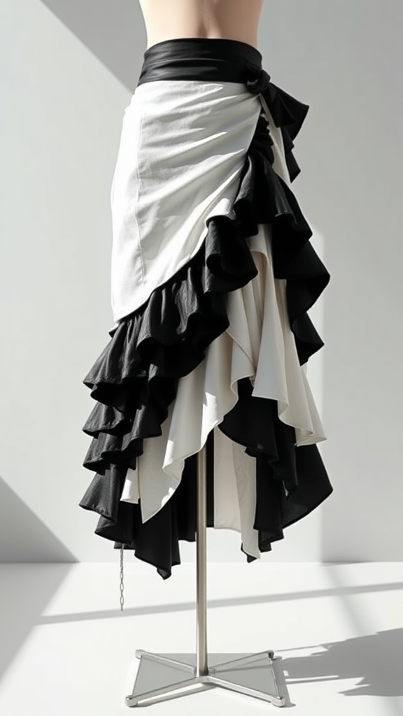 Front view of a skirt with a bold and edgy design, showcasing asymmetric ruffles and intricate leather accents, captured from a high angle. The piece reflects the avant-garde style of Ann Demeulemeester, with a striking black and white color scheme. Bathed in direct sunlight, the skirt stands out against a sleek and minimalistic backdrop. Rendered using V-ray in 3ds Max, this vision does not include a mannequin, allowing the garment's unique structure and texture to command attention.