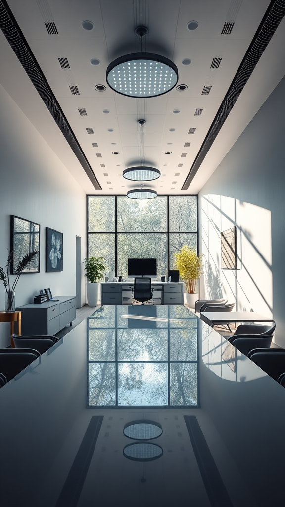 Front view of a sleek office space, captured with a Sony A7R IV and 85mm lens. The setting features a minimalist design, enhanced by contemporary decor and high gloss surfaces. Cool-toned lighting combines with the bright afternoon sun to create a vibrant atmosphere. Modern light fixtures add a touch of sophistication, casting subtle patterns on the walls. The room exudes a professional yet welcoming ambiance, perfectly blending natural elements with high-tech style.