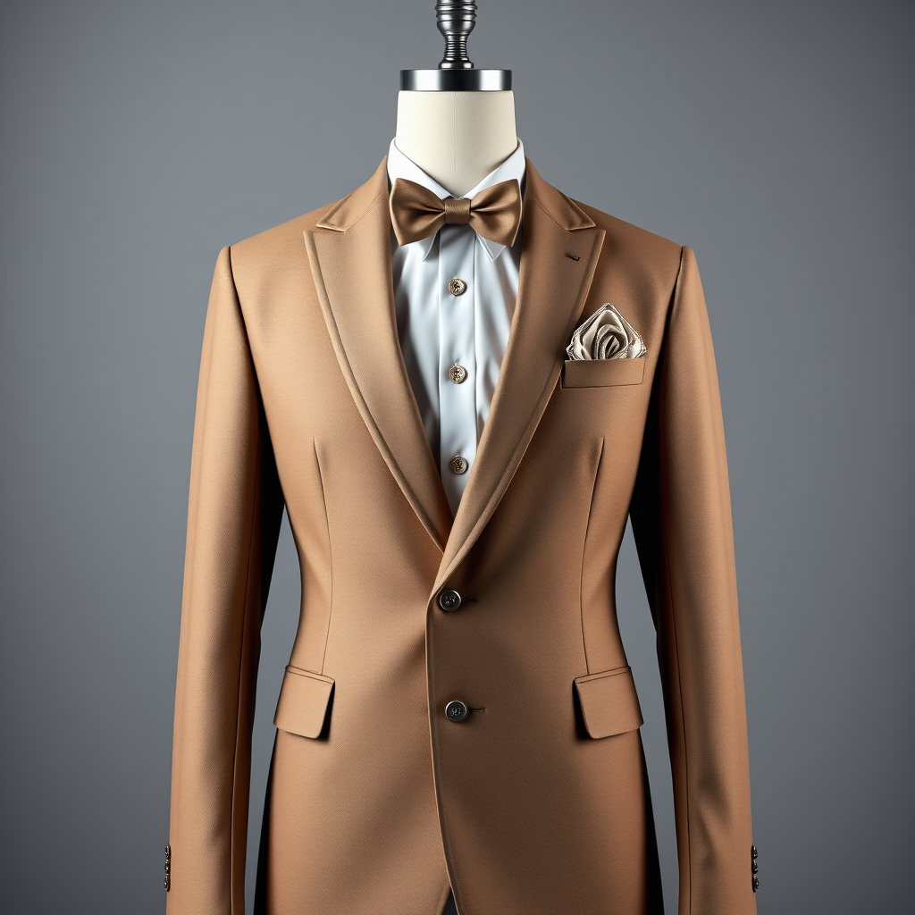 Front view of a sophisticated blazer crafted with tailored fashion elements, adorned with an elegant bowtie and a tasteful pocket square placed at the lapel, captured from a subtle side angle, reimagined by Calvin Klein. Showcasing a refined and harmonious color palette, with a soft backlight highlighting the ensemble against a minimalist and smooth gray background, rendered using Unreal Engine and V-ray technology, emphasizing the design without the use of mannequins.