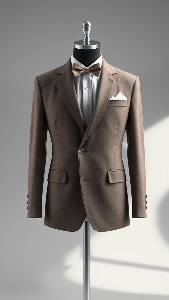 Front view of a sophisticated blazer, showcasing tailored fashion design with a distinct bowtie and elegant pocket square positioned at the lapel, captured from a dynamic side perspective, envisioned by Calvin Klein. The piece features a muted, refined color palette, accented by an artistic backlight, set against a minimalist, clean gray background. Rendered with Unreal Engine and V-ray for a lifelike finish, optimized in a 2:3 aspect ratio, ensuring focus solely on the attire itself without a mannequin.