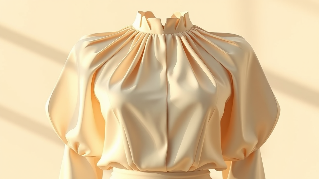 Front view of a sophisticated blouse design with a high neckline and delicate pleats at the shoulders, envisioned in the style of Cristobal Balenciaga, presented in a soft, neutral color palette. The scene is illuminated with gentle crepuscular rays against a minimalistic, beige backdrop, highlighting the elegance of the garment. Enhanced using Octane render and V-ray, the design is captured meticulously, with artistic adjustments subtly incorporated to maintain the original essence while adding a fresh, creative twist.