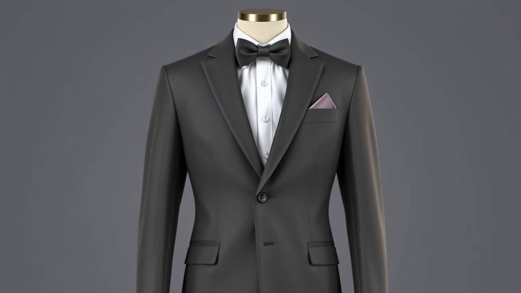 Front view of a stylish blazer, showcasing a bowtie and elegantly folded pocket square on the lapel, captured from a slightly angled perspective, designed by Calvin Klein, with a sophisticated and muted color palette, featuring soft backlighting against a minimalist gray background, enhanced with Unreal Engine and V-Ray for a realistic finish, maintaining a clean and modern look without the presence of a mannequin.