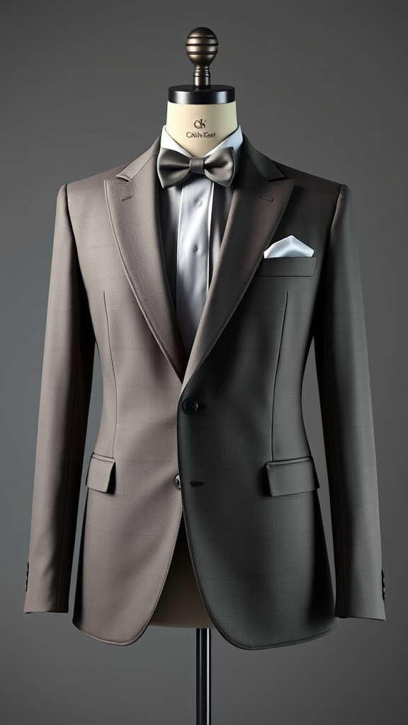 Front view of a tailored blazer design featuring a sleek bowtie and elegant pocket square on the lapel, captured from a subtle side angle, inspired by Calvin Klein's signature style; a sophisticated color palette with a soft backlight against a minimalist gray background, rendered using Unreal Engine and V-ray to highlight refined textures and detailing --ar 2:3 --v 5.1 --q 2 --no mannequin.