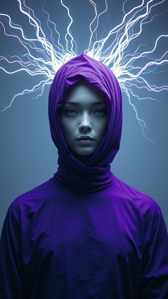 Front view of an androgynous figure, wrapped in avant-garde purple attire, stands in a surreal electromagnetic display, with energy radiating from its head, creating an enigmatic aura. The face is a blank canvas, heightening the mysterious atmosphere. Set in a minimalist environment with low-key lighting that amplifies the mystical essence, the scene reinterprets reality with creative flair. Rich in detail and realism, this composition captures the unknown through a unique lens.