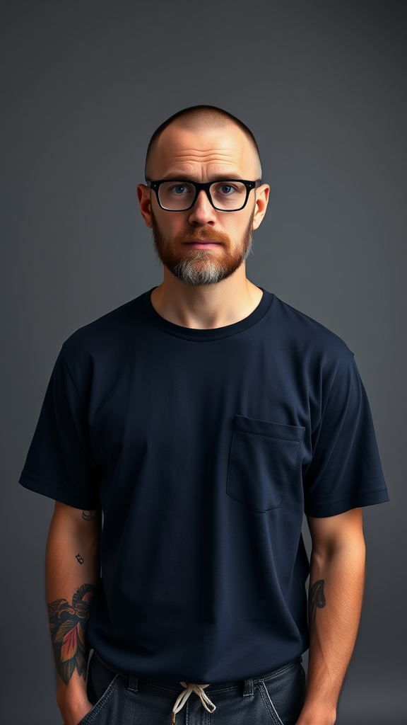 Front view photograph of a professional male model with shaved hair and a neat beard, wearing horn-rimmed glasses. He is standing against a solid grey background in a photo studio, gazing confidently into the camera. The model has expressive wrinkles on his forehead, captured in the style of a Richard Avedon photo. The photo was taken using a Sony α9 II camera with a Sony FE 100-400mm f/4.5-5.6 GM OSS lens. He is dressed in a dark navy loose XL t-shirt featuring a subtle logo on the left chest pocket. His arms showcase a detailed tattoo, while he pairs the t-shirt with deep-wash denim jogger pants featuring a minimal and innovative design. The image has a high contrast, highlighting the model's presence and expression in photography. Emphasizes clarity and realism without unnecessary elements or imperfections.