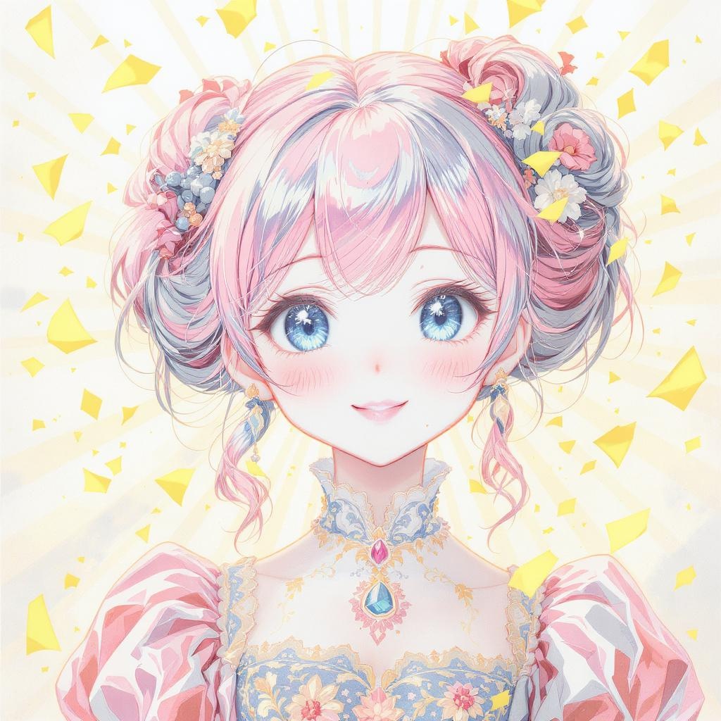 Front view portrait photograph, vibrant yet subtle negative contrast background, radiating glowing sunshine with natural light, exceptionally strong front light, masterpiece of high quality hyperdetailed intricate ultra-realism, flat color pastel blend 2D vector art featuring one adorable girl with an expression of hopefulness and cheer, with rosy cheeks and symmetrically styled flowing fluffy pink and blue hair, exquisitely detailed glossy lips and soft, smooth porcelain-like skin, captivating hyperdetailed anime-style sparkling blue eyes, intricate, ornate clothing reminiscent of Mary Cassatt’s style painting, with many tiny glowing yellow paper fragments drifting gracefully through the air, characterized by precise hard pencil and brush strokes, suitable for album cover art; this clean, colorful symmetrical 2D vector illustration art is rendered in flat colors at an extraordinary resolution of 128K, presenting a glamorous digital artwork and colorful ink illustration with hyperdetailed sharp focus, resulting in a perfect composition in digital illustration.