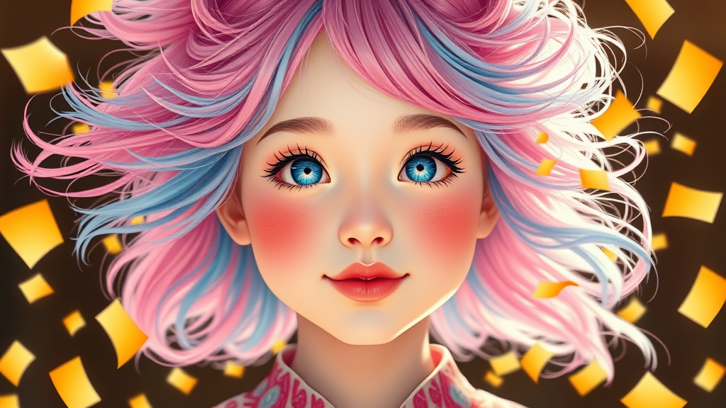 Front view portrait photograph of a cute girl with an expression of hope and cheer, against a negatively contrasted background bathed in glowing sunshine and natural light, with very strong front light. Her red cheeks and intricate, ultra-realistic flying fluffy pink and blue hair symmetrically contrast. Her eyes are intricate anime-style blue, highly detailed with a soft gloss. Her lips are beautifully detailed with gloss. She has soft, smooth white skin. She's dressed in hyperdetailed, intricate clothing inspired by Mary Cassatt's style. The scene features many tiny glowing yellow papers floating in the air, with precise hard pencil and brush strokes. This 2D vector art is crafted as an album cover art, showcasing clean, colorful, and symmetrical composition. The artwork is hyperdetailed with sharp focus, vibrant in a pastel mix, presented in 128K resolution, exuding glamour. It's a digital painting that merges elements of colorful ink illustration and digital illustration, achieving a perfect composition.