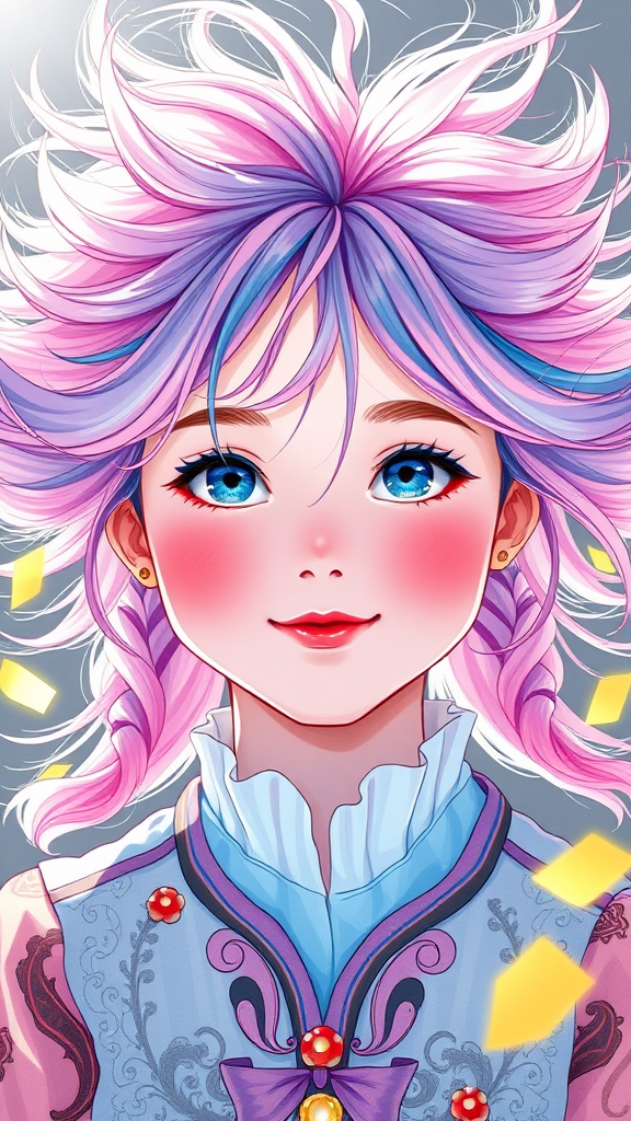 Front view portrait photograph of a cute girl with an expression of hope and cheerfulness, her cheeks flushed red. The scene features a negative contrast background under glowing sunshine, bathed in natural light with very strong front lighting. Her flying, fluffy hair is symmetrically styled in a blend of pink and blue colors, highlighting her hyperdetailed, beautiful glossed lips and soft, smooth white skin. Her anime-themed bright blue eyes are intricately detailed, capturing a sense of vivid realism. She is dressed in hyperdetailed, intricate clothing reminiscent of Mary Cassatt's style, with the entire scene rendered with precise hard pencil and brush strokes. Tiny glowing yellow papers float in the background, adding a whimsical touch. The artwork, suitable for an album cover, is clean, colorful, and symmetrical, executed in 2D vector art with flat colors. The image is created in an astonishing 128K resolution, exuding glamour as a piece of digital art, with a perfect composition and colorful ink illustration that provides hyperdetailed sharp focus.