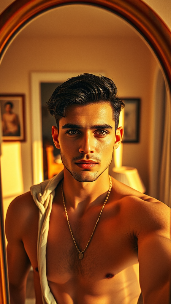 Full-angle shot hyper-realistic photograph of an attractive man in stylish beachwear, captured with exquisite detail using ray tracing technology. His perfectly groomed short dark hair offers a striking contrast in a cozy, well-lit room that embraces the warmth of golden hour. This iPhone 14 photograph taken in a mirror brings out intricate textures and a sense of serenity, reminiscent of film grain captured on Kodak Portra 800, f1.8, enhancing the richness and depth of the image. The room glows with a soothing ambiance, adding a touch of tranquility to the scene.