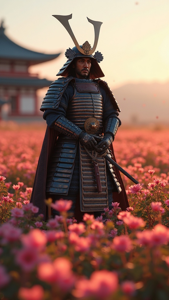 A samurai in intricate full armor with an ornate helmet and katana stands regally on a vibrant plain adorned with blossoming flowers. The scene is bathed in cinematic lighting, showcasing the full potential of Unreal Engine 5. The photograph is captured with a 70mm lens, emphasizing depth of field and a tilt blur effect. The shutter speed is set at 1/1000, aperture f/22, and white balance at 32k, ensuring super-resolution and a megapixel-rich ProPhoto RGB color space. The atmosphere is immersive, with tall, epic visuals reminiscent of Artgerm and Alex Ross. Halfrear lighting with a backlight creates a natural yet moody incandescent ambience. Optical fiber, volumetric effects, and contre-jour techniques enhance the scene's drama. Global illumination, ray tracing reflections, and a red rim light complement the cool color grading. Shadows are deep and shimmering, with scattering and glowing effects. Ray tracing ambient occlusion and cutting-edge anti-aliasing (FKAA, TXAA, RTX) refine the image. The scene comes alive with OpenGL and GLSL shaders, while post-processing includes cel shading and tone mapping for a hyper-realistic finish. VFX and SFX add to the hypermaximalist, elegant, and dynamic pose of the samurai, centered for perfect photographic composition.
