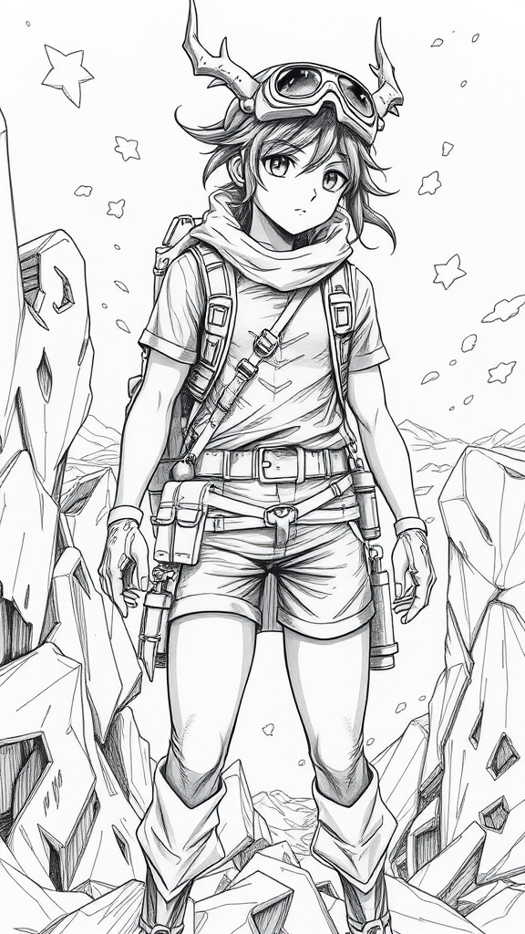 Full body adventurer, manga style, comic book, black and white, pencil sketch, detailed and intricate, trending on art platforms, extreme details, cinematic masterpiece, stunning and evocative environment, intricate lineart, captivating, award-winning, with a shiny and smooth finish, surreal and elegant, oil painting aesthetics, soft yet fascinating fine art, official CGI quality, 3D rendered, doll-like features, with unique and imaginative anatomy, hinting at surrealism, slightly abstract elements merging reality and dream-like qualities, a fine blend of human and mythological traits.