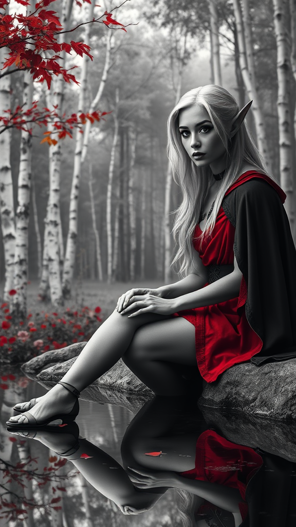 Full body black and white photo of an exquisite elven woman sitting beside a pond in the forest, featuring blonde eyebrows and reflective dark eyeshadow. She dons makeup, rim lighting, and dramatic chiaroscuro to enhance her beauty. Her attire includes a red cloth, high heels, and a black cape, surrounded by white trees and Roman arches. The scene captures the essence of birch trees, red and yellow leaves, and expansive white clouds. Artists like John Constable, Ed Blinkey, Atey Ghailan, Jeremy Mann, Greg Manchess, and Antonio Moro inspire this intricate, highly detailed artwork. Trending on ArtStation and CGSociety, the composition emanates a touch of fantasy through its graceful storytelling.
