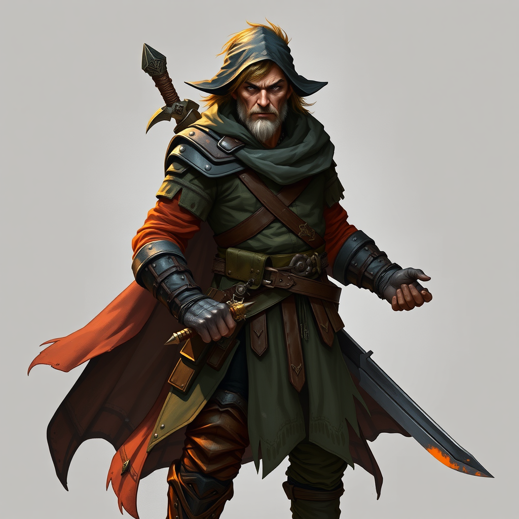 Full body character sheet detailed male visage rogue RPG fantasy balanced features D&D dungeons dragons adventure attire unique weaponry dynamic pose mysterious aura