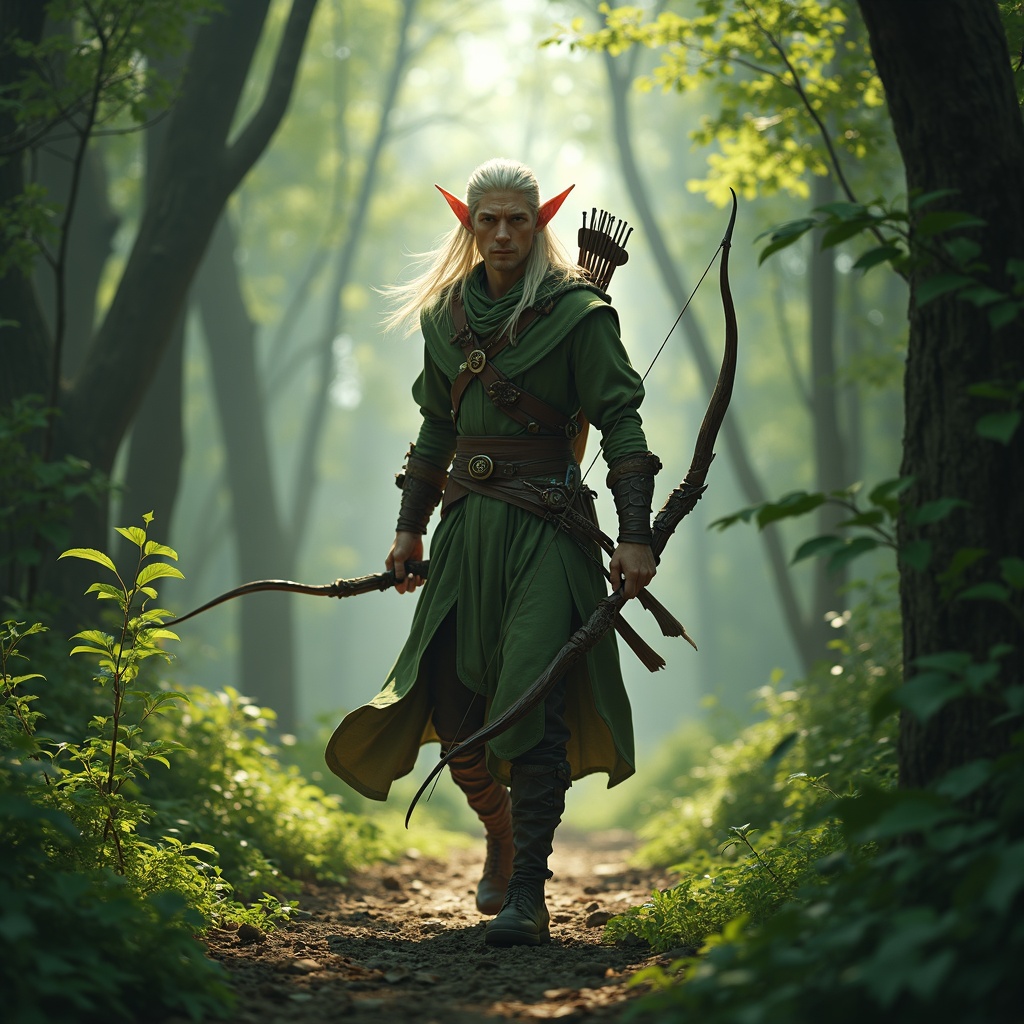 View this AI-generated image featuring full body male elf in a dynamic walking pose resembling tanis from dragonlance portrayed as an expert archer surrounded by the lush greenery of a dense forest his eyes are sharp and expressive adding depth to his detailed face the scene captures a masterpiece o