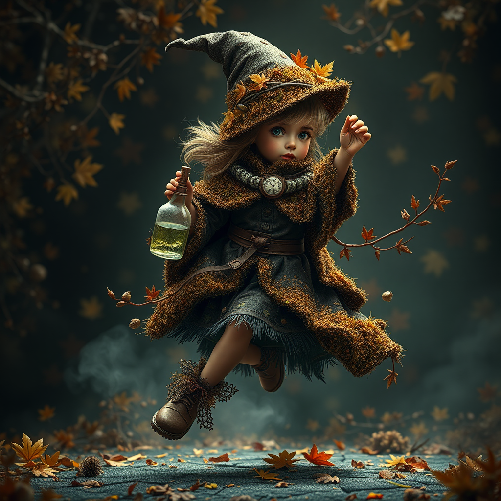 Full body dance pose of a little girl wizard moving in slow motion, crafted from autumnal foliage and plants. Her cloak is a blend of brown moss and dark leather forming intricate patterns. She's wielding a bottle of toxic spellcraft in a dark, moody universe background filled with a variety of autumn-colored plant matter. The scene is captured with insanely detailed clarity, exhibiting high-quality digital art akin to concept artwork, rendered in 16k resolution. The illustration showcases high sharpness with a focus on detailed pupils and facial features. Achieve a photorealistic, sharp depiction of her perfect form, complete with intricate shadows. The art style channels the influence of Chao Teng Zhao, presented with a 3D effect, embodying a masterpiece of photorealism. The overall composition is rich with bloom and depth, ensuring a visually arresting and ornate finish.
