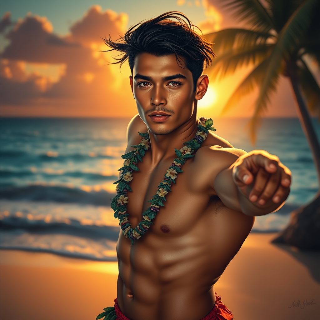 Full body depiction of a strikingly handsome Hawaiian male dancer on an idyllic tropical beach, youthful and athletic, with a chiseled physique, captivating eyes, and an alluring face, captured in a ray-traced, ethereal and dream-like photo-realistic oil painting style reminiscent of Studio Ghibli and Robert Wyland; featuring dramatic and cinematic lighting with a 50mm lens effect, showcasing hyper-realistic and highly detailed elements. Subtle artistic modifications include a gentle breeze tousling his hair and a serene sunset casting a warm, golden glow, adding depth and vibrancy to the scene.