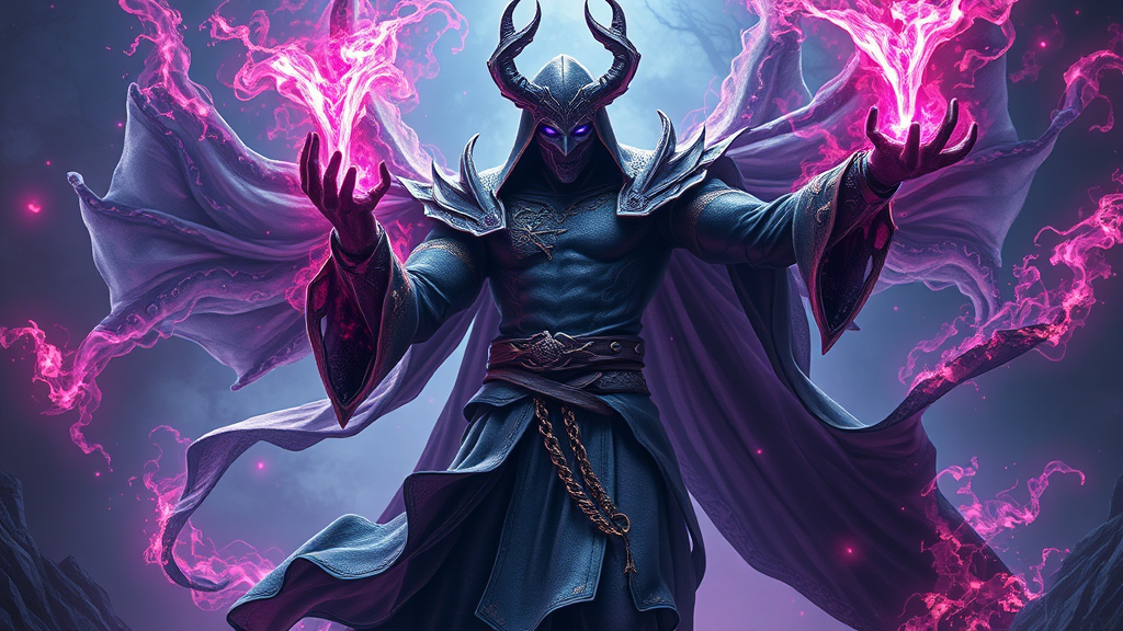 Full body depiction of a void sorcerer, hyper-detailed with intricate textures, radiant volumetric lighting, fantasy-inspired art style, enhanced with vivid colors and ethereal elements, high-quality rendering reminiscent of cinema, atmospheric and dynamic composition for a visually captivating scene.