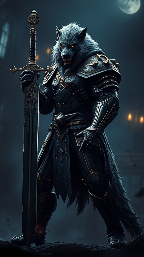 Full body depiction of Blaidd the werewolf from Elden Ring, characterized by a werewolf form wielding a large sword and clad in dark, intricately detailed armor. The scene is set in a dark fantasy ambiance, showcasing realistic and cinematic lighting. The focus is on a solo male figure, created in digital art style with hyper-detailed elements highlighting Blaidd’s perfect anatomy and detailed snout. The artwork emphasizes clarity and precision without any distortions like text errors, blurriness, or compression artifacts. The composition avoids any low-quality output or unwanted inclusions such as signatures, watermarks, or artist names. The portrayal maintains anatomical accuracy, steering clear of malformed or mutated features, all while being respectful and non-explicit in its presentation.