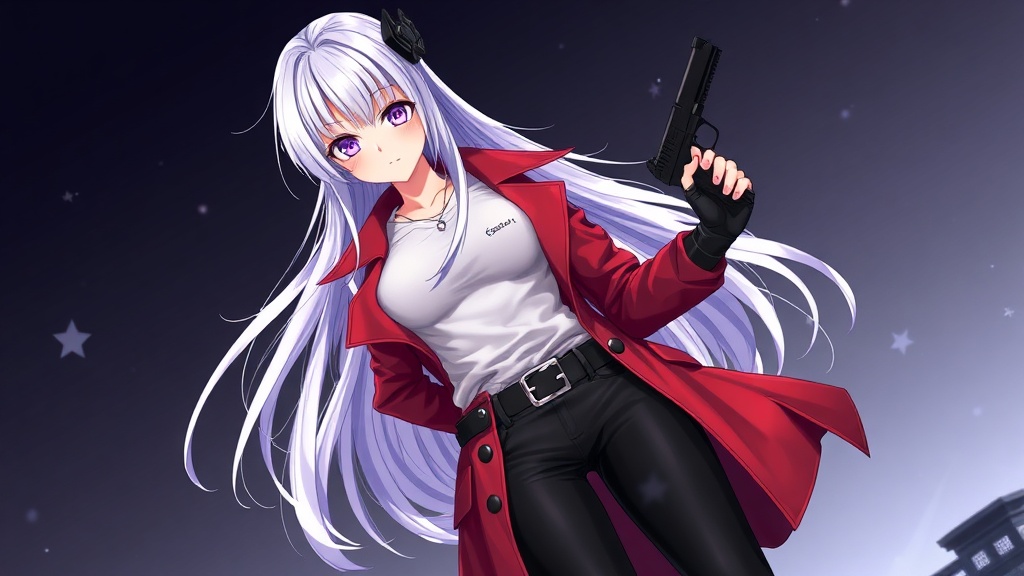 Full body digital art of an anime female character in a fantasy setting, featuring a high-quality, high-resolution design. She has long, flowing white hair and striking clear purple eyes that enhance her clear face. Wearing a red trench coat draped over a white shirt, she pairs it with black pants, stylish black boots, and a matching black belt. The character holds a pistol confidently in her right hand, emanating a perfect balance of allure and power. Her face is adorned with perfect eyes, red lips, and a seductive expression that adds to her charm. The character embodies a captivating presence, with small imaginative details, while maintaining a cohesive and enchanting appeal.