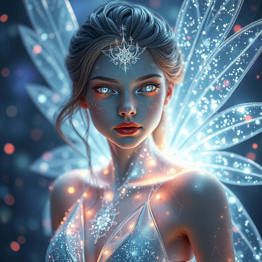 Full body, ethereal fairy made of shimmering silver light, surrounded by multicolored magical particles in an atmosphere inspired by Moebius, featuring a lifelike beautiful face with detailed radiant eyes and glossy lips, enveloped in pastel bloom lighting. Rendered with artistic finesse akin to FromSoftware, drawing from the Elden Ring aesthetic, and hinting at an epic Boss Stage Battle with dynamic Ray Tracing Beams. Exquisitely detailed with extremely smooth blending and sharp 8k focus, capturing a sense of delicate realism and otherworldly grace.