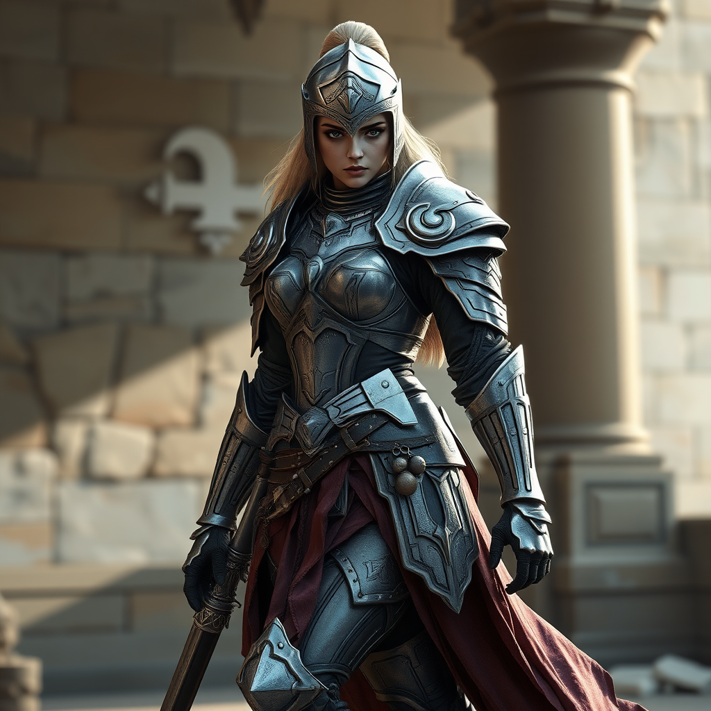 Full body female paladin in a walking pose depicted in slow motion, clad in intricately detailed armor, with an expressive and captivating face and eyes. The scene is a masterpiece, showcasing the best quality in 8k photorealism, channeling the artistic styles of Jeremy Mann, Sandra Chevrier, and Maciej Kuciara. The image features sharp and realistic details, including authentic shadows, with elements that blend 3D realism with touches of cartoon and anime aesthetics. While predominantly realistic, subtle artistic sketches add depth and uniqueness to the portrayal.