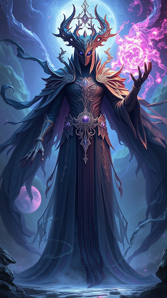 full body illustration of a void arcanist with intricate details, ethereal lighting, fantastical elements, and hyper-realistic textures, enhanced with vivid colors and dynamic shadows, dreamlike and immersive fantasy setting, rendered with high clarity and precision