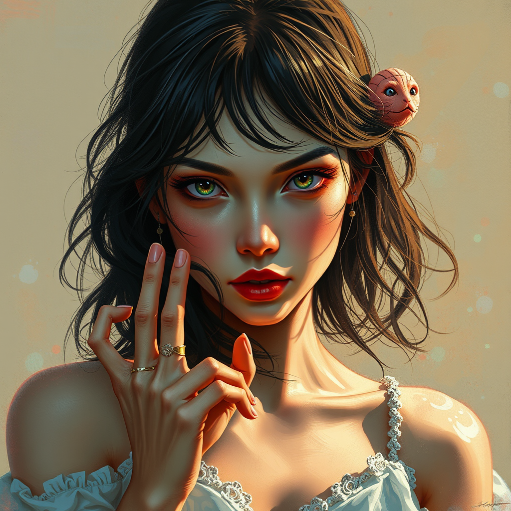 Full body illustration of an exquisite artistic representation, featuring a captivating woman gazing directly at the viewer, reminiscent of the magical styles of Ed Blinkey, Atey Ghailan, and Studio Ghibli. Influenced by the techniques of Jeremy Mann, Greg Manchess, and Antonio Moro, the artwork is intricately detailed and trending on platforms like ArtStation and CGSociety. Exhibiting photorealistic and sharp focus through oil painting, the piece is crafted in the vein of creations by Midjourney and Greg Rutkowski. Although vivid and sometimes peculiar colors enhance the dramatic flair, the work incorporates blurred and surreal elements with cartoonish and 3D aspects. While maintaining artistic charm, the artwork features unconventional visual traits like extra elements, abstract hand formations, unique facial expressions, and slight disproportion, all encapsulated in a lovingly crafted, imaginative, and morphed narrative scene, showcasing a blend of traditional and contemporary styles. The creativity extends through elements that may seem whimsical or abstract, offering a unique narrative to the viewer within its framed presentation.