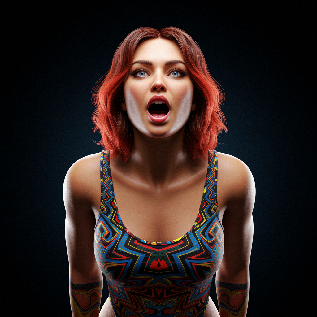 Full body image, hyper-realistic fashion photoshoot featuring an exquisite model, eyes wide open, showcasing an abstract digital art masterpiece. Vibrant DMT-inspired patterns, striking and dynamic pop art elements combined with vray-like tracing. Bold zigzag details, seamless elegance, and powerful, emotive poses with a hint of robotic grace and expressionism, set against a 4:5 aspect ratio, creating a captivating fusion of modern artistry and timeless beauty.