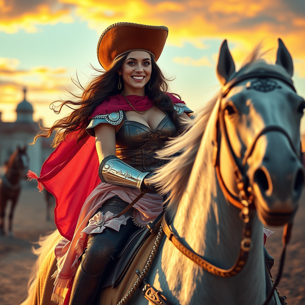 full body image of a woman dressed as a cowgirl knight riding a horse, exuding happiness with a bright smile, embodying a sweet and charming demeanor, reminiscent of a venetian carnival atmosphere, engaged in an action-packed scene as if in a whimsical battle, set against a breathtaking sunset backdrop, captured in high resolution with a hyper-realistic style, evoking the grandeur and depth of an oil painting reminiscent of works by Frank Frazetta, with creative flourishes adding an imaginative twist to the scene.