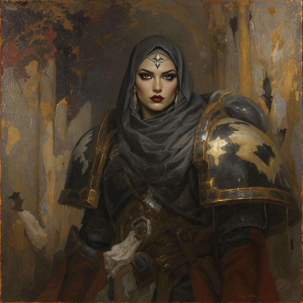 A stunning full-body image of a striking woman embodying the essence of a Sister of Battle, standing amidst the ruins of a grand cathedral. Her face is symmetrical and detailed, with reflective eyes, dark eyebrows, and expertly applied mascara and makeup. She wears armor that is worn and cracked, contributing to the intense Warhammer 40k style. The background shows damaged marble walls with dust particles, bullet holes, and dramatic rim lighting. The scene is painted in a professional, majestic impressionism oil style reminiscent of artists like Waterhouse, John Constable, and Jeremy Mann. The piece features intricate detailing, with a veil and steel headwear adding to her mystique. This art is trending on platforms like ArtStation and CGSociety, capturing the dramatic and high-detail essence. Elements like a forehead tattoo add uniqueness, while maintaining the overall gritty yet beautiful portrayal of a warrior in a decayed sanctuary.