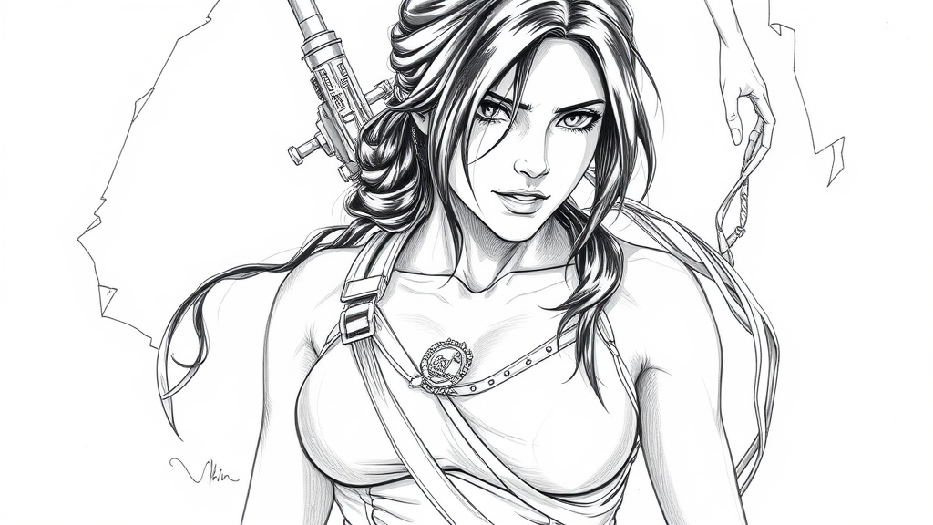 Full body Lara Croft, manga, comic book, black and white, pencil sketch, highly detailed, intricate, showcased on artstation, exceptional details, cinematic, awe-inspiring, photography, captivating environment, lineart, evocative, award-winning, lustrous, smooth, surreal, divine, celestial, elegant, reminiscent of an oil painting, soft, mesmerizing, fine art, official art CGI, 3D, doll-like, octane, rendered with artistic imperfections, creatively exaggerated anatomy, blurred elements, surreal additional limbs, abstract and imaginative design.