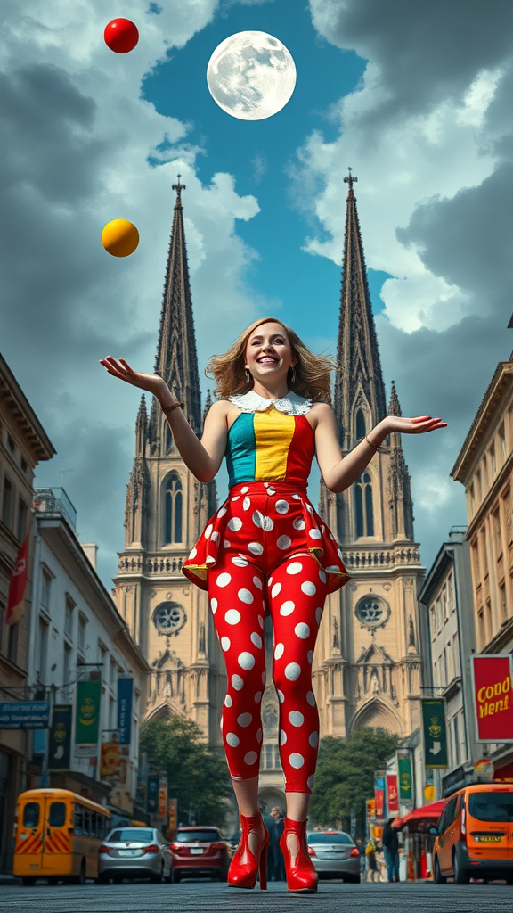 Full body of a woman with a kind smile, dressed in a clown-inspired pin-up style, stands amidst a bustling city scene. She radiates happiness and generosity, juggling colorful balls with deft skill. Her attire features vibrant leggings adorned with polka dots, and her presence brings a sense of joy to the urban landscape. A grand cathedral rises in the background, adding an element of majesty to the scene. The sky above is ominously beautiful, with a full moon peeking through partially clouded skies, casting a soft, volumetric light. The scene is rendered in hyper-realistic detail, echoing the signature style of an oil painting by Frank Frazetta, capturing the intricate play of light and shadow that enhances the lively and warm ambiance of the setting.