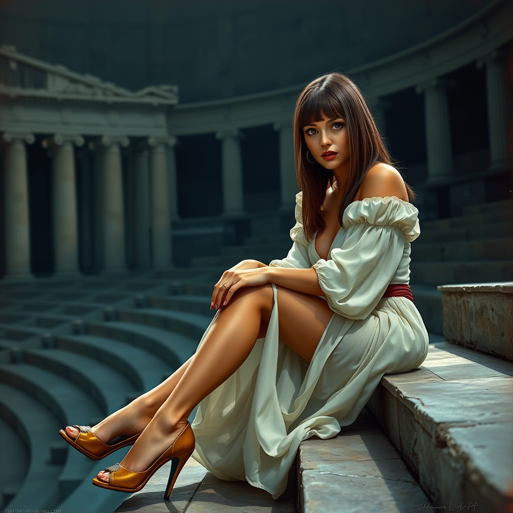 Full body painting of the most enchanting woman in the world, seated gracefully in a Greek amphitheater, dressed in historical attire, with middle-parted straight hair. Her reflective eyes capture the viewer’s attention amidst her elegant posture, highlighted by dramatic chiaroscuro lighting. The scene features delicate rim lighting that accentuates her legs and thighs, with high heels adding to her poised demeanor. The setting and composition are reminiscent of a majestic impressionist oil painting by masters like Waterhouse, John Constable, and Jeremy Mann. This artwork, marked by intricate detail and high drama, is trending on ArtStation and CGSociety. The impression is both professional and immersive, with the visual storytelling invoking the styles of artists like Ed Blinkey, Atey Ghailan, Greg Manchess, and Antonio Moro, making subtle creative modifications while maintaining the core essence of timeless beauty.