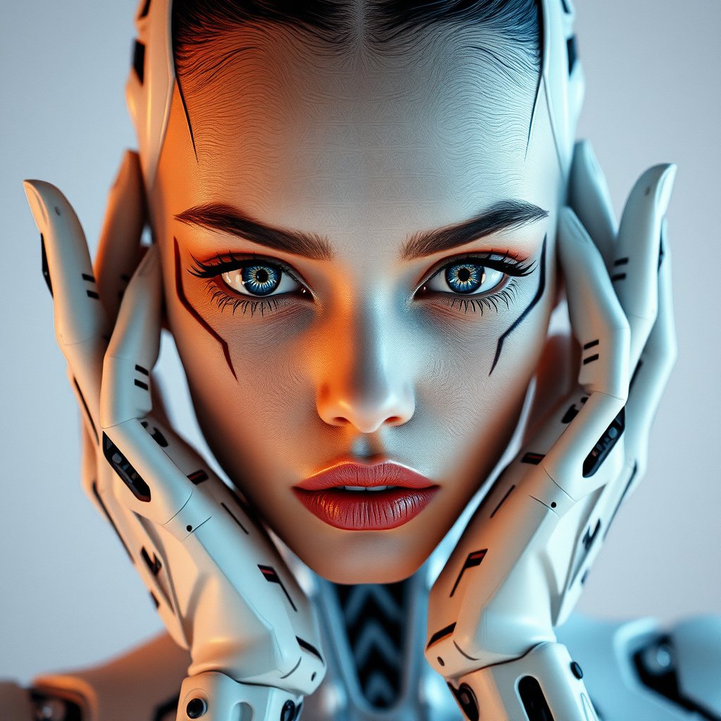 Full body photo, hyper-realistic DMT-inspired fashion photoshoot with a stunning model. Eyes wide, an abstract digital masterpiece, ethereal white tones, vivid pop art influences, vray-rendered with intricate detail, dynamic zigzag patterns, sophisticated and emotive poses, robotic yet expressive essence, futuristic and bold --s 550 --v 6.0 --ar 4:5