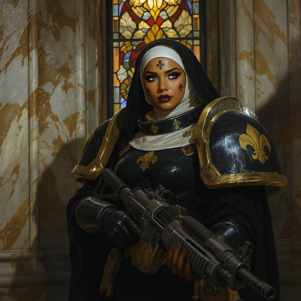 "Full body photo of a strikingly beautiful woman with tanned skin and a fleur de lys face tattoo, dressed as a Sister of Battle holding a bolt rifle in front of a stained glass window. Her detailed, symmetrical face is framed by dark eyebrows and enhanced with mascara and subtle makeup. Her armor is adorned with wax seals, reflecting a sci-fi nun aesthetic drawn in Warhammer 40k style. She stands against marble walls with dust particles illuminated by dramatic lighting, the scene inspired by professional majestic impressionism oil paintings. The lighting details, including rim lighting and chiaroscuro, add depth to her reflective eyes. This image echoes the styles of Waterhouse, John Constable, and modern artists like Ed Blinkey and studio-influenced aesthetics from Studio Ghibli. The artwork appears intricately detailed, capturing a sense of drama and trending techniques seen on platforms like ArtStation and CGSociety, with influences from Makoto Shinkai's Kyoto landscapes. The composition maintains high detail and inspiring artistry."