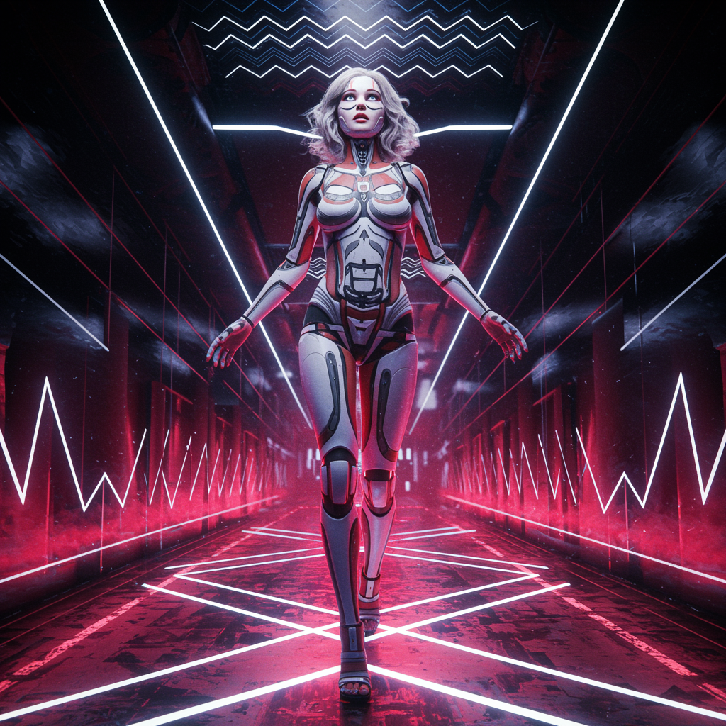 Full body photo of a stunning model in a hyper-realistic DMT-inspired fashion photoshoot, capturing eyes wide open amid an abstract digital masterpiece. The scene exudes vibrant pop art elements with bold white DMT accents and intricate zigzag patterns. The model embodies a mix of elegance and emotive poses, juxtaposed with a hint of robotic expressionism. Enhanced by vray tracing for a strikingly vivid effect, the composition maintains a 4:5 aspect ratio, immersing the viewer into a world of surreal beauty with subtle creative twists.