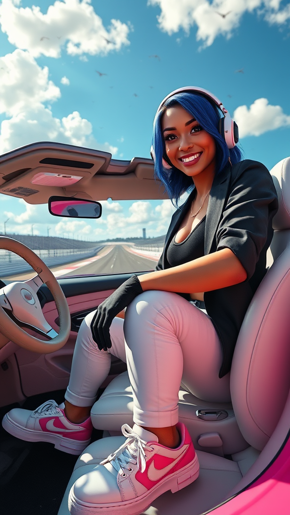 Full body photo of an elegant woman, beautiful racing enthusiast driving a convertible, featuring white leather seats, glowing tanned skin, striking cheekbones, open mouth smile, expressive eyes, dark well-defined eyebrows, expert mascara, subtle makeup, wearing stylish racing gloves. The scene captures dust particles in the detailed lighting with rim and dramatic chiaroscuro effects. She's dressed in a sleek black crop top and an open jacket, complemented by crisp white yoga pants and eye-catching large pink sneakers. The racetrack setting with a road, bleachers, under a vibrant blue sky with fluffy white clouds and birds in flight evokes a sense of energy and motion. The artistic style draws inspiration from John Constable, Ed Blinkey, Atey Ghailan, Studio Ghibli, Jeremy Mann, Greg Manchess, and Antonio Moro. It trends on platforms like ArtStation and CGSociety, emphasizing intricate, high-detail, and dramatic elements. The character has iron mouse-inspired blue hair, paired with headphones, and a pink convertible, framed in a cartoon-like 3D style, avoiding weird colors or blurriness for a harmonious and aesthetically pleasing composition.