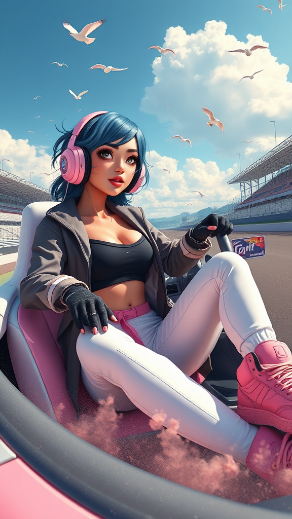 Full body photo of the most beautiful woman in the world, a stunning racing girl driving a convertible with white seats, showcasing tanned skin and striking cheekbones. She has an open mouth and reflective eyes under dark eyebrows, adorned with mascara and makeup. She wears racing gloves, surrounded by dust particles in detailed, dramatic lighting with chiaroscuro and rim effects. Dressed in a black crop top with an open jacket, white yoga pants, and large pink sneakers. The scene is set on a race track with a road, bleachers, blue sky, white clouds, and birds flying. The style is inspired by the works of John Constable, Ed Blinkey, Atey Ghailan, and Studio Ghibli, rendered in a painterly 3D cartoon style, featuring vibrant colors. She sports blue hair, similar to iron mouse, and wears headphones, driving a pink car. The artistic influence includes Jeremy Mann, Greg Manchess, and Antonio Moro, creating an intricate, high-detail image that is trending on ArtStation and CGSociety, with elements of Makoto Shinkai and Kyoto animation influences.