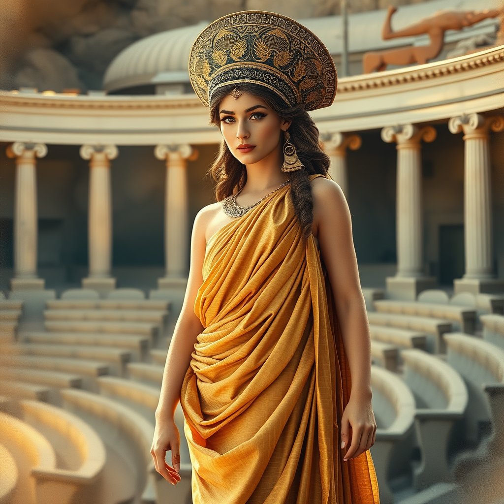 full body photo of the most iconic woman of ancient greece, stunning goddess-like beauty, regal demeanor, exceptional drop-down eyelashes, ethereal glow, balanced face proportions, majestic nose, full lips, intense inner light, historical greek costume with elaborate headdress, intricately woven golden fabric, long flowing skirt, sovereignlike posture, central focus, body language exuding confidence, effortless elegance, sensual legs leading out to delicate sandaled feet, trending on ArtStation, trending on CGSociety, Low key lighting with a hint of soft golden glow, commentary to the serene environment of an ancient Greek amphitheatre, Electronic toned watercolor oil painting in a blend of masterful brushstrokes, enchanting artistic skills exhibited, richness reminiscent of Berkley church, trending on appropriate platforms