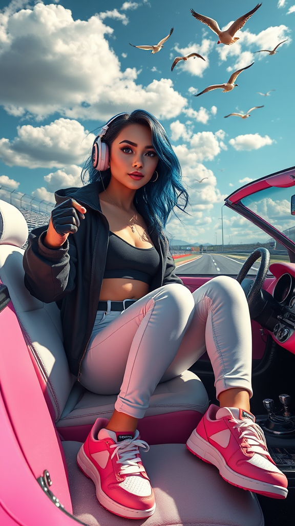 Full body photo of the most stunning woman in the world, beautiful racing enthusiast driving a convertible with sleek white seats, sun-kissed skin, striking cheekbones, luscious dark eyebrows, mascara enhancing her eyes, adorned with stylish racing gloves; the scene is filled with captivating dust particles illuminated by intricate rim lighting, dramatic chiaroscuro effects, and detailed lighting. She wears a chic black crop top under an open jacket, paired with white yoga pants and standout large pink sneakers. Set against the backdrop of a race track with an open road, surrounded by bleachers beneath a vibrant blue sky dotted with fluffy white clouds and soaring birds. Influenced by the artistic styles of John Constable, Ed Binkley, Atey Ghailan, Studio Ghibli, Jeremy Mann, and Greg Manchess, creating a composition that's trending on ArtStation and CGSociety for its complexity and high detail. Her striking blue hair draws inspiration from characters like Ironmouse, complemented by headphones that blend seamlessly into the art. The convertible is a vivid pink, adding a pop of color. This cartoon-like 3D artwork maintains its stunning quality while incorporating the creativity of renowned artists.
