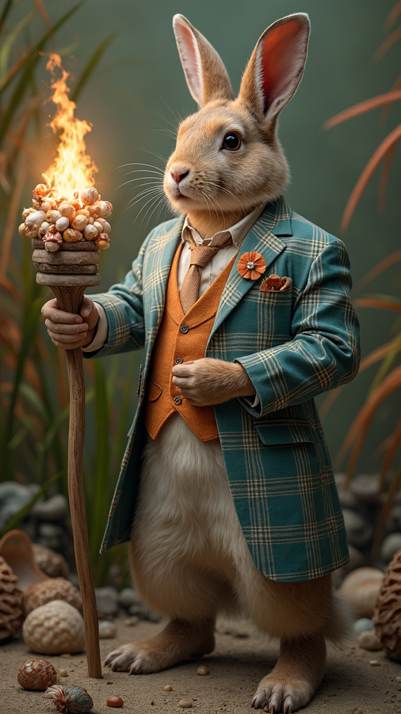 View this AI-generated image featuring full body portrait of a charismatic martinican rabbit dressed in an elegant madras suit humanoid in form holding a wooden torch adorned with shimmering seashells set against a backdrop of multicolored grass and iridescent conches with an air of regal authority