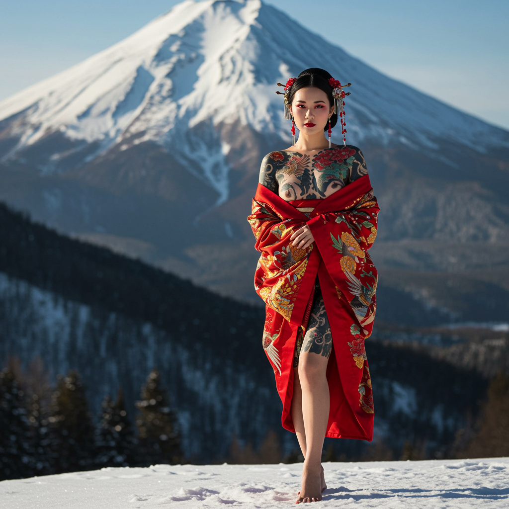 A captivating full body portrait of an elegant Asian woman standing against the backdrop of a snow-covered mountain. Her expression is serene yet commanding, her hair styled neatly with traditional hairpins and delicate red tassels. She is draped in a flowing red kimono that is slightly shorter, revealing intricate tattoos sprawling across her shoulders, showcasing exquisite floral and bird designs in rich detail. Her bare legs touch the snowy ground with grace, as she stands barefoot. Her makeup is striking, with bold red accents enhancing her eyes and lips, harmonizing with her ornate jewelry, featuring dangling red earrings. The scene beautifully merges cultural elegance and the serene beauty of nature, with the majestic snowy mountain providing a tranquil and awe-inspiring setting.