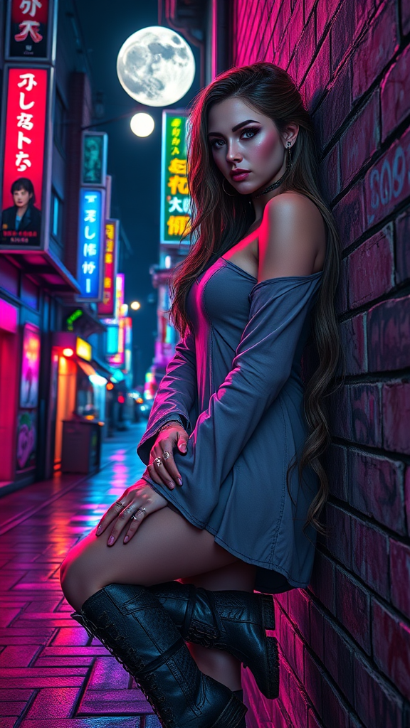 Full body portrait of a cyberpunk woman leaning against a wall in a neon-lit city street at night, illuminated by vibrant city lights and a glowing moon. The scene features colorful lighting and reflections, showcasing a cyberpunk woman with a symmetrical, detailed face and expressive eyes. She has long, flowing hair and distinct makeup, accessorized with numerous ear piercings and rings. Her outfit includes long sleeves and bracelets, complemented by well-worn, muddy boots. The setting is enriched with a brick wall covered in artistic graffiti. The portrait is inspired by the styles of Waterhouse, John Constable, Ed Blinkey, Atey Ghailan, Studio Ghibli, Jeremy Mann, Greg Manchess, Antonio Moro, known for intricate, high-detail, and dramatic compositions. The artwork trends on ArtStation and CGSociety, resonating with the dramatic flair of Kyoto's neon nights, captured with an impressionistic, majestic oil painting approach.