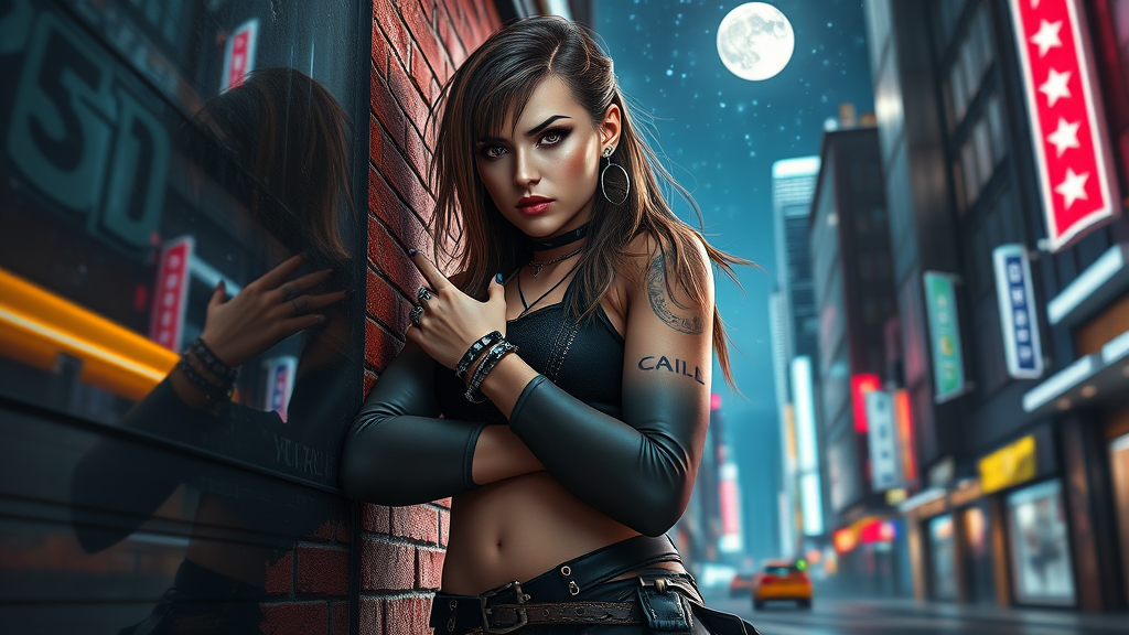 Full body portrait of a cyberpunk woman leaning against a wall in a neon-lit city street at night, vibrant city lights reflecting off skyscrapers, a starry sky with a bright moon casting subtle radiance. The woman, embodying a futuristic aesthetic, stands in a dynamic pose, featuring a determined scowl on her symmetrical face. She has long flowing hair and edgy short bangs, with a punk-inspired style. Adorned with numerous rings, her eyes are reflective, enhanced by striking makeup and multiple ear piercings. The scene is bathed in dramatic chiaroscuro and rim lighting, accentuating her long sleeves, stacked bracelets, and the textured urban environment, complete with brick walls and artistic graffiti. Her muddy boots boast black shoelaces as she exudes a majestic yet rebellious aura, reminiscent of professional majestic impressionism by Waterhouse, Ed Blinkey, and the likes of Studio Ghibli. This intricate and high-detail piece is trending on platforms like ArtStation and CGSociety, capturing the dynamism and allure of a cyberpunk world, inspired by the artistic styles of Makoto Shinkai Kyoto, Jeremy Mann, and Antonio Moro.