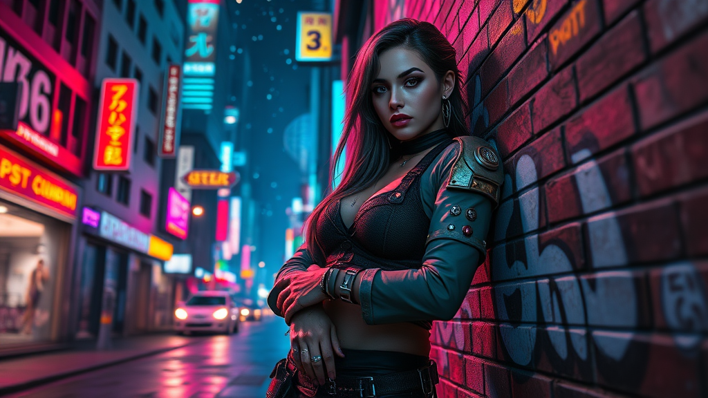 Full body portrait of a cyberpunk woman leaning against a wall in a neon-lit city street at night, vivid city lights and a starry sky overhead, colored lighting highlighting her features; a futuristic vibe pervades the scene. The woman sports long hair, a symmetrical and detailed face with sharp features and reflective eyes, enhanced by bold makeup and facial tattoos. Her ears are adorned with multiple piercings, and her style reflects an alt-punk aesthetic, characterized by long sleeves and numerous rings and bracelets. She stands confidently in muddy boots, the textures of her attire vividly detailed. The brick wall behind her is adorned with vibrant graffiti, complemented by dramatic chiaroscuro lighting that casts compelling shadows. This scene, inspired by the majestic impressionism of Waterhouse and the atmospheric storytelling of Studio Ghibli, echoes the high-detail artistry of creators like Jeremy Mann and Greg Manchess. The piece trends on platforms like ArtStation and CGSociety, presenting an intricate and mesmerizing tableau further enriched by the style of Makoto Shinkai and the allure of Kyoto's cityscapes, all while avoiding exaggerations or distortions in anatomy or form.