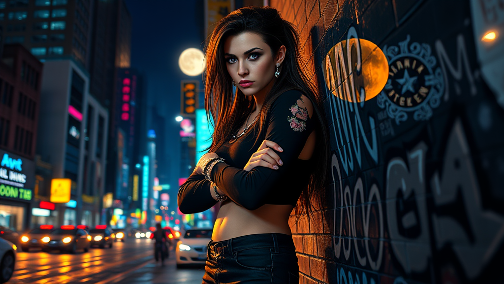 Full body portrait of a cyberpunk woman leaning against a wall in a bustling cyberpunk city street at night, illuminated by vibrant city lights and a glowing moon. Her reflective eyes and bold makeup accentuate her scowling, symmetrical face framed by long, flowing hair. An alt girl with punk flair, she sports multiple ear piercings, rings, and bracelets over long sleeves, exuding a dramatic presence. The intricate lighting includes rim and chiaroscuro effects, enhancing the scene's depth. She stands confidently in muddy boots against a brick wall adorned with graffiti, capturing the essence of a futuristic city landscape. Inspired by majestic impressionism, the artwork melds elements from renowned artists like Waterhouse, John Constable, and Studio Ghibli. This high-detail scene trending on ArtStation and CGSociety, avoids pitfalls like poor anatomy, mutations, or extra limbs, ensuring a stunning, professional piece.