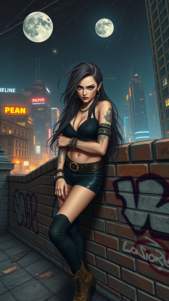 Full body portrait of a cyberpunk woman standing against a city wall in a futuristic urban landscape at night, surrounded by vibrant city lights and a starry sky with a prominent moon. Her long hair flows as she sports a detailed, symmetrical face with subtle makeup and reflective eyes. She embodies the punk and alt girl aesthetic, adorned with many rings, ear piercings, and bracelets over her long sleeves. Leaning on a graffiti-covered brick wall, she exudes a defiant scowl. Her outfit is completed by muddy boots, resonating with the gritty city vibe. The scene is highlighted by intricate and dramatic lighting, including rim and chiaroscuro effects. The ambiance is reminiscent of professional majestic impressionism oil paintings by masters like Waterhouse and John Constable combined with modern influences from Atey Ghailan, Studio Ghibli, and Jeremy Mann. It captures a high-detail, intricate scene that is trending on platforms like ArtStation and CGSociety, echoing the visual storytelling style of Makoto Shinkai and evoking a sense of dynamism and allure.