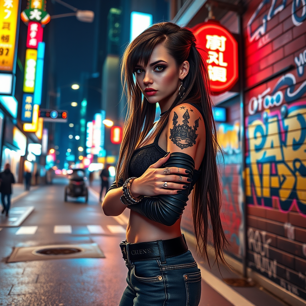 Full body portrait of a cyberpunk woman standing on a bustling city street at night, illuminated by vibrant city lights, showcasing colored lighting effects. The woman stands confidently on the pavement with a scowl, highlighting her long hair and detailed symmetrical face. She embodies a punk and alt girl aesthetic with many rings, reflective eyes, dramatic makeup, and multiple ear piercings. The scene is enriched with intricate lighting, including rim lighting and chiaroscuro, against a backdrop of a brick wall adorned with graffiti. Her attire features long sleeves and an array of bracelets. This artwork is envisioned as a majestic impressionism oil painting, inspired by Waterhouse, John Constable, Ed Blinkey, Atey Ghailan, Studio Ghibli, Jeremy Mann, Greg Manchess, Antonio Moro, and is trending on ArtStation and CGSociety. The piece is intricate, highly detailed, and dramatic, drawing inspiration from Makoto Shinkai's Kyoto style. The setting is completed with elements of a distant lake, ocean, or river, all encapsulated within the elegance of a canvas frame.