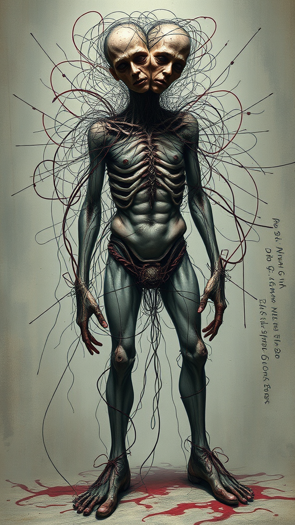 Full body portrait of a disturbing man, heavily inspired by surrealism and nightmares, featuring dark and eerie themes. Entwined lines and particles form this digital illustration, echoing styles of Greg Rutkowski and Yoji Shinkawa. Rendered in 4k, the concept art is a trending piece on ArtStation showcasing deliberately distorted anatomy. The figure possesses extra limbs and irregular proportions, with exaggerated, disfigured features. The face, hands, and feet are crudely depicted, reminiscent of a forgotten dreamscape. A double head rests atop a disproportionate neck. The chaotic composition seems to step out of frame, evoking a sense of terror, unsettling yet artistically fascinating.