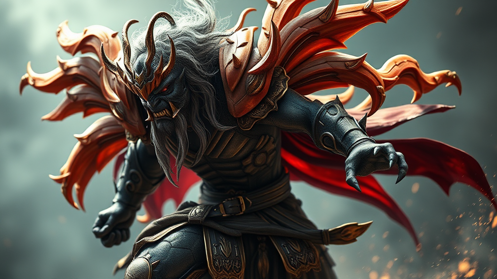 Full body portrait of a formidable game character, a fierce deity in motion, exuding power and aggression, captured with exceptional clarity and detail using a Hasselblad H4D 200MS Digital Camera and a Mitakon Speedmaster 65mm f/1.4 XCD lens, illuminated with dramatic Fresnel lighting, showcasing dynamic movement, with an aspect ratio of 1:2, and infused with an aura of mythic intensity.